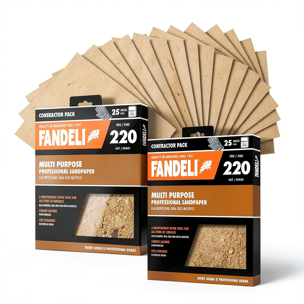 Fandeli 220 grit sandpaper sheets on a workbench